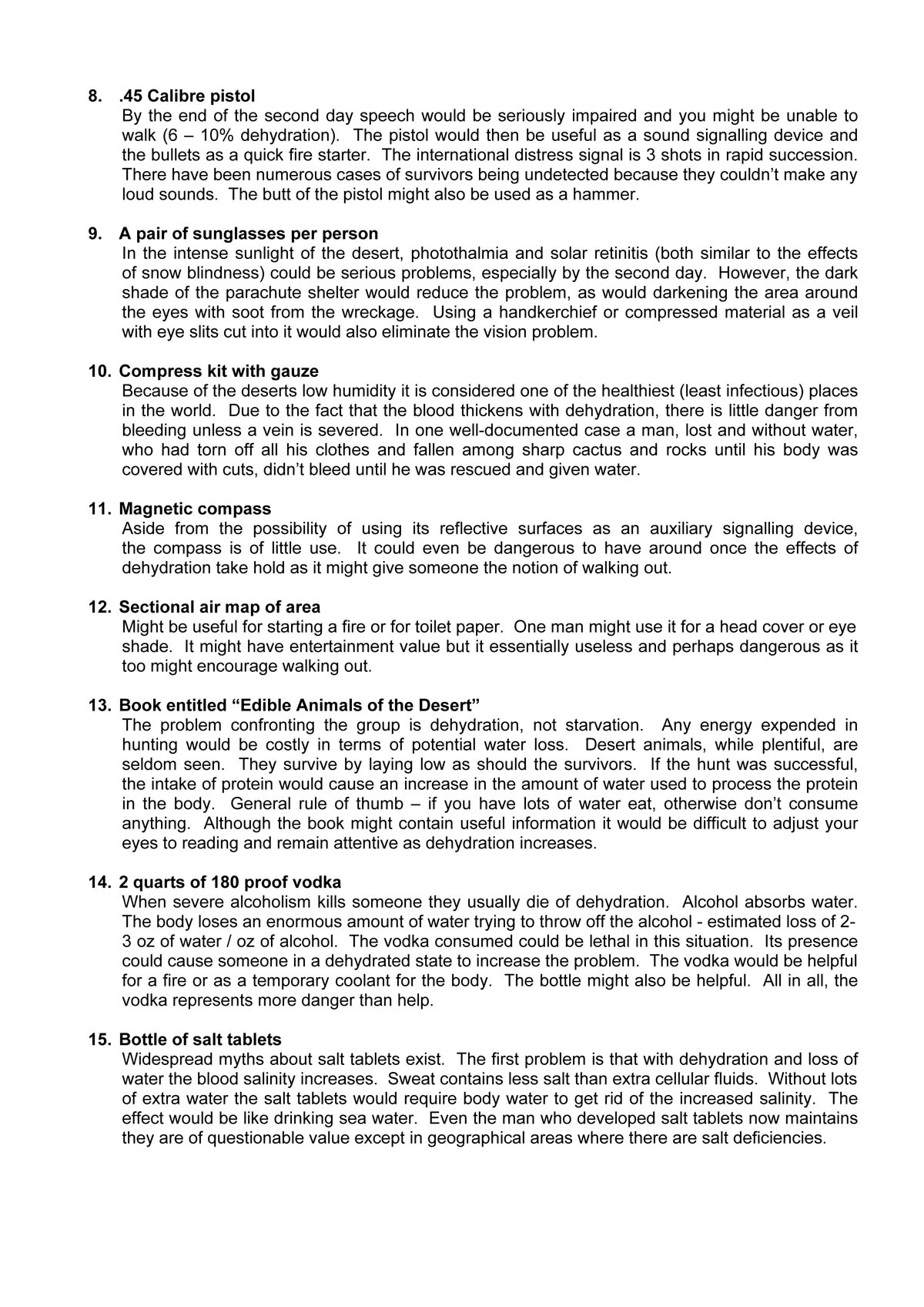 - L’animateur du jeu présente la situation aux joueurs : Ils sont les seuls survivants d’un crash d’avion, et se retrouvent en plein désert avec une liste de 15 objets à leur disposition.